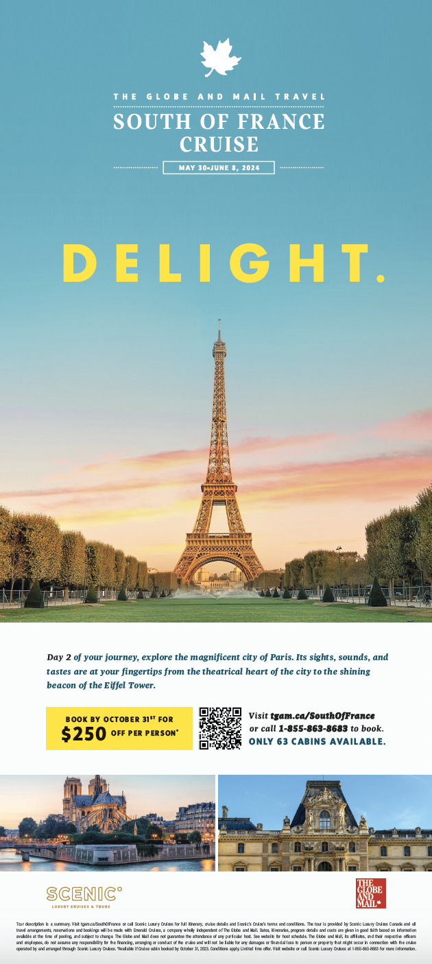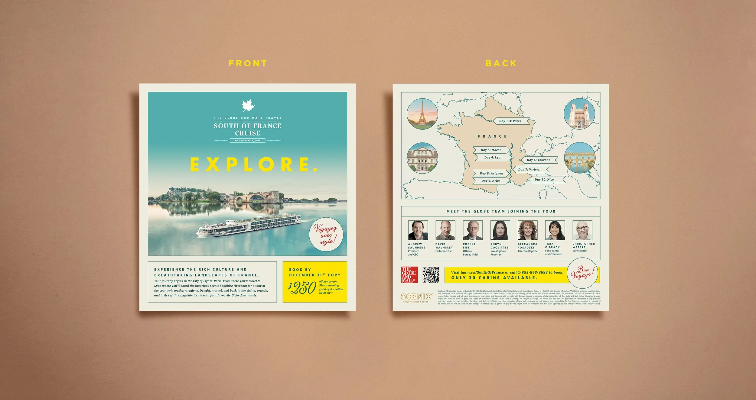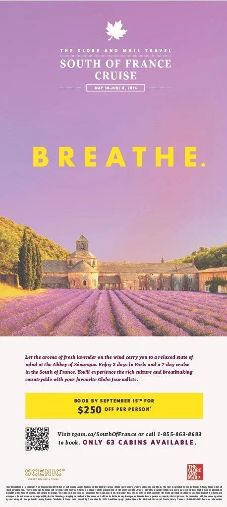 To promote The Globe and Mail Travel’s 2024 cruise to the South of France, my team wanted to create ads with a fresh new look, different from the Globe’s traditional approach. With Wes Anderson’s whimsical style as our inspiration, we delivered a series of simple yet elegant ads that transport the reader to the well-known locales, and instill the emotion they evoke.